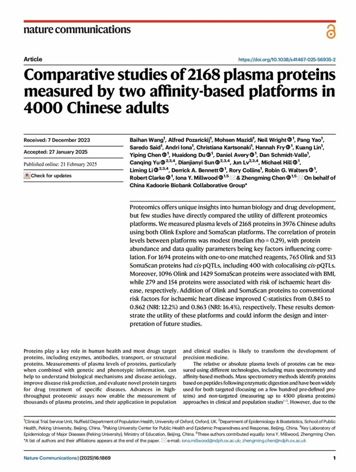 - Wang, B., Pozarickij, A., Mazidi, M. et al. Comparative studies of 2168 plasma proteins measured by two affinity-based platforms in 4000 Chinese adults. Nat Commun 16, 1869 (2025).